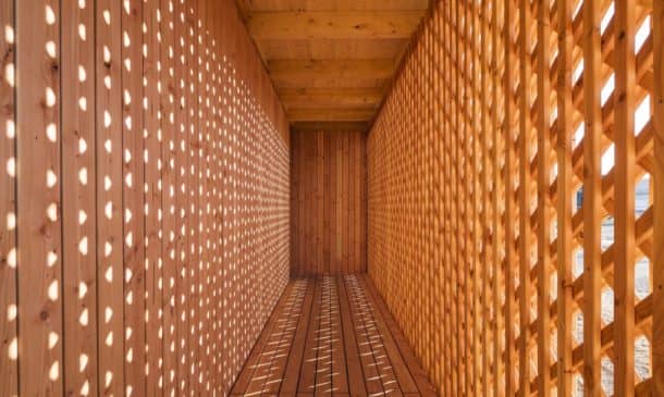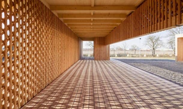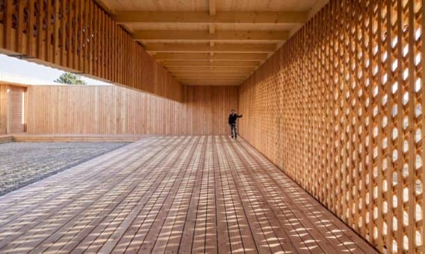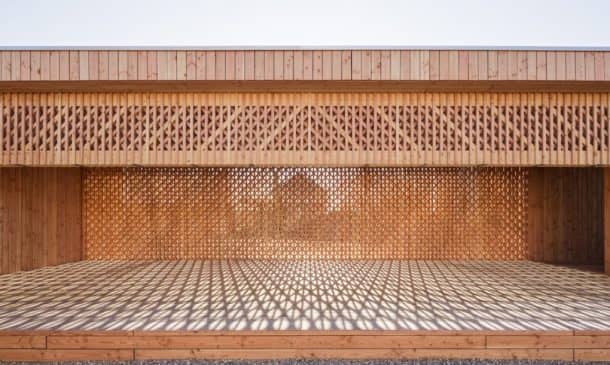 该结构的主墙由花旗松制成,墙壁采用对称网格,以实现结构支撑、自然通风和照明,创造出光影的游戏。