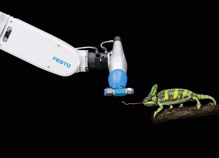 最后,FlexShapeGripper(与奥斯陆大学的联合项目)是一个硅胶盖,该硅帽连接到机器人手臂上,模仿了变色龙舌头的运动。该帽子充当吸入物体,甚至是平坦的物体,例如卡片和电话。Festo will showcase all three machines at the Hannover Mess trade show in Germany in May 2015. Unfortunately, playing with one of these robots will not be possible, as they’re only intended to “develop technical concepts and industrial applications based on models from nature.”