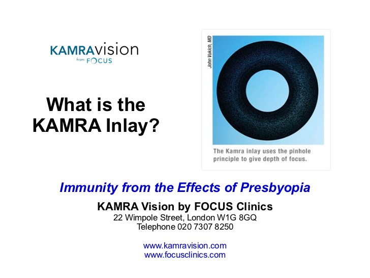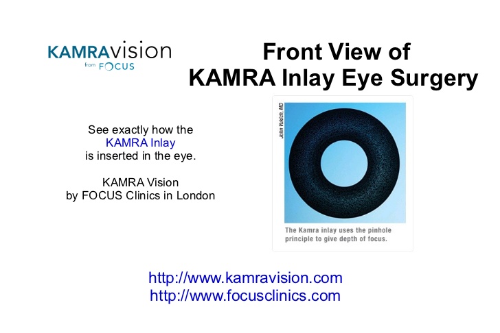 Kamra镶嵌物是一个微观盘,直径为3.8mm,中心开口。它比隐形眼镜小得多,比一粒盐轻。一旦将眼睛插入,它就会为近视和中间视觉提供改进的焦点,而不会影响远处的视力。当掉入覆盖眼前的角膜的小口袋中时,设备充当摄像头孔径调节,以便观众可以看到近外。插入植入物的过程相对较快,持续约10分钟,需要局部麻醉。插入方法涉及将眼睛张开,并将甜甜圈形镶嵌置于角膜中。