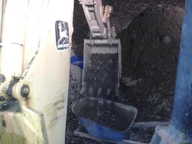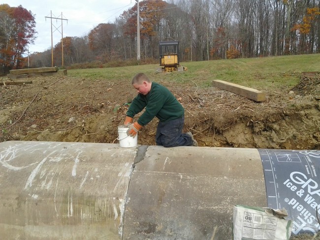 将管子固定在一个地方后,下一步是用泥浆填充大水泥管的左右间隙。