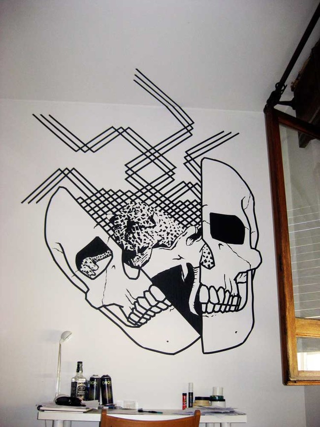 他将胶带分层,以赋予阴影和详细的线条工作的错觉。用磁带作为媒介的想法是一个偶然的发现。他用胶带遮住了一幅画的一部分,就像胶带自己形成的清晰线条一样。