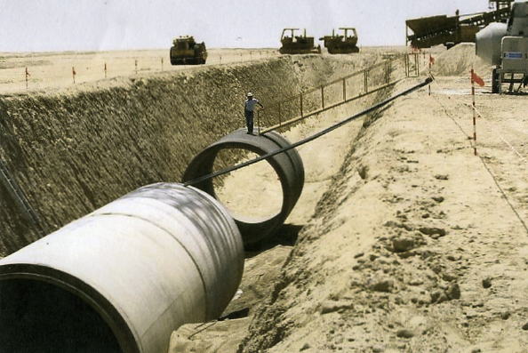 1984年8月,Brega的Muammar Gaddafi奠定了管道生产厂的基础。因此,启动了伟大的人造河项目。该项目由大约1,300井进入沙漠土壤深处,深处500米,以便从地下水储量中抽水。管道路线穿过了黎波里,班加西,苏尔特和其他地方的城市,通过一个长达2,800公里的地下管道网络为约650万人提供水。该管道于1996年首次到达了项目的第一阶段。