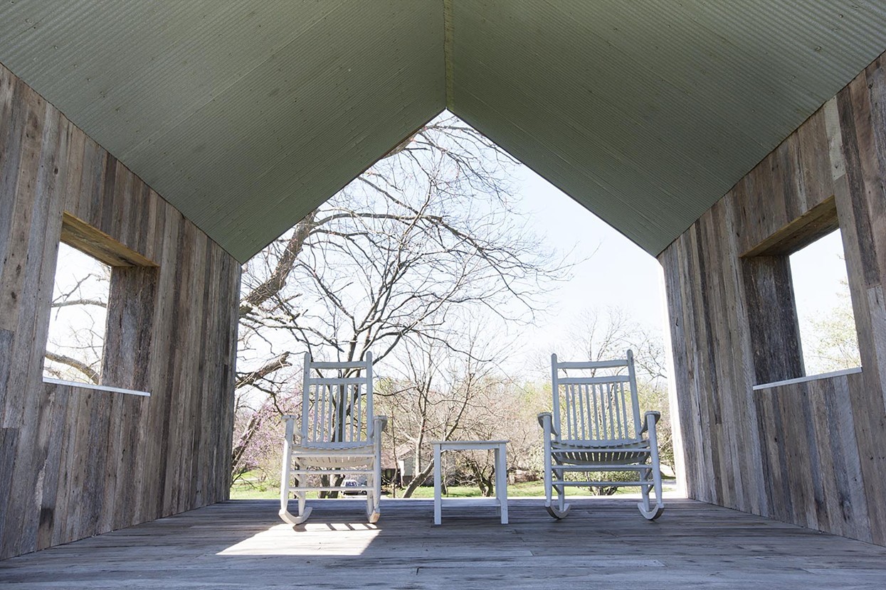 “Located at Springfield, MO’s largest farmers’ market, CLOUD HOUSE is a poetic counterpoint to the busy market, inviting visitors to a meditative space in which they can slow down, enjoy the fresh edible plants, and listen to the rain on a tin roof. “