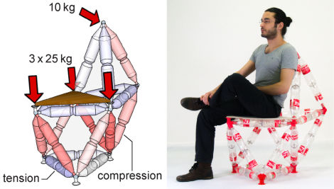 TrussFab软件还可以自动计算结构上的应力和负载,从而设计了例如可以支撑180磅人类的苏打瓶椅子的结构。