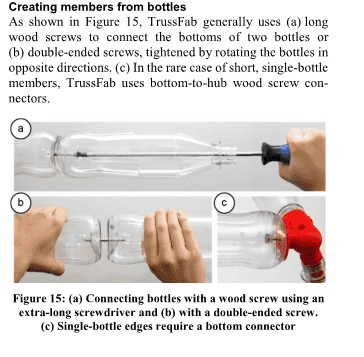 Trussfab的软件还设计了足够的定制塑料连接器,该连接器可以连接到足够小的瓶头,以便在台式3D打印机上制造。然后,简单地使用双端木螺钉将瓶子的底部拧紧。所有这些细节都在叙述他们的论文。