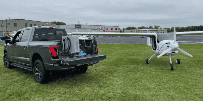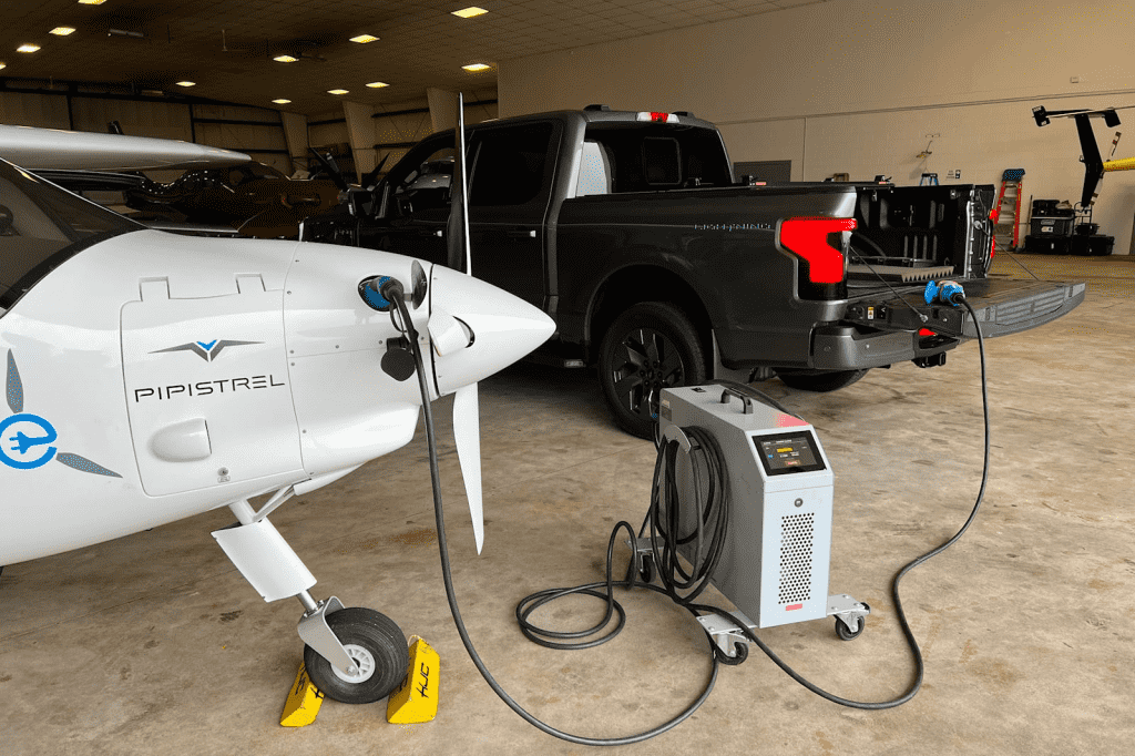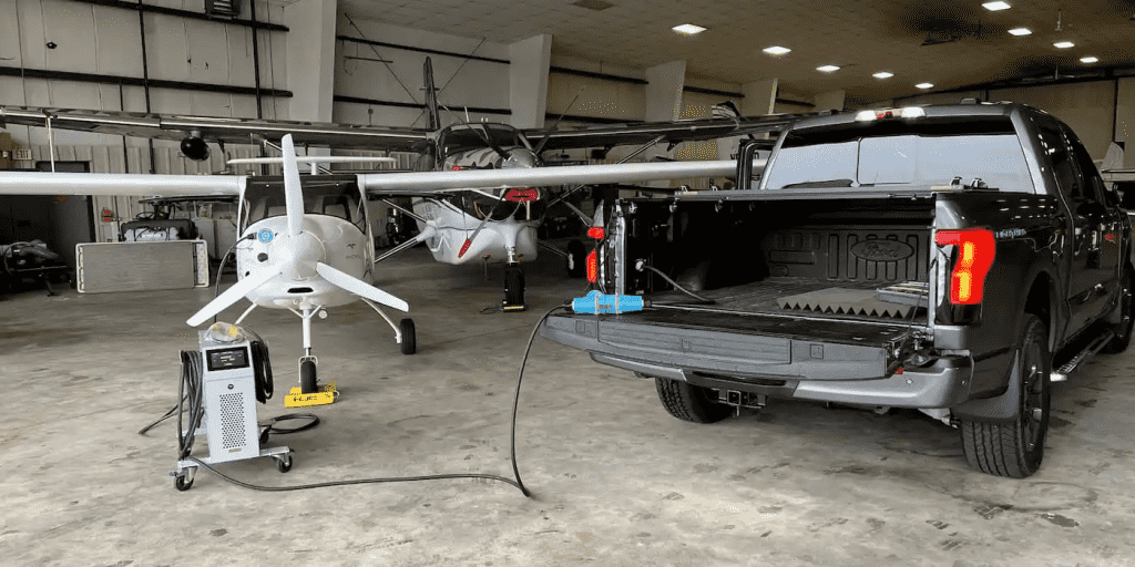 拉斐德学院的学生,雷米Oktay组织第一个电动飞机立交桥在体育赛事11月19日,2022年,在Lafayette-Lehigh足球游戏。电动飞机位于康涅狄格州的哈特福特,而且必须飞到伊斯顿,宾夕法尼亚州。问题是,电动汽车飞机需要三次充电,没有充电基础设施,所以福特f - 150闪电所有者投手上台。