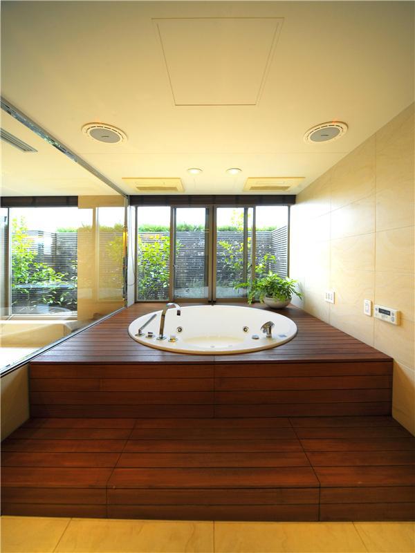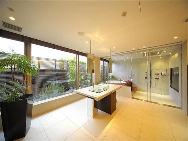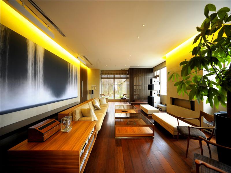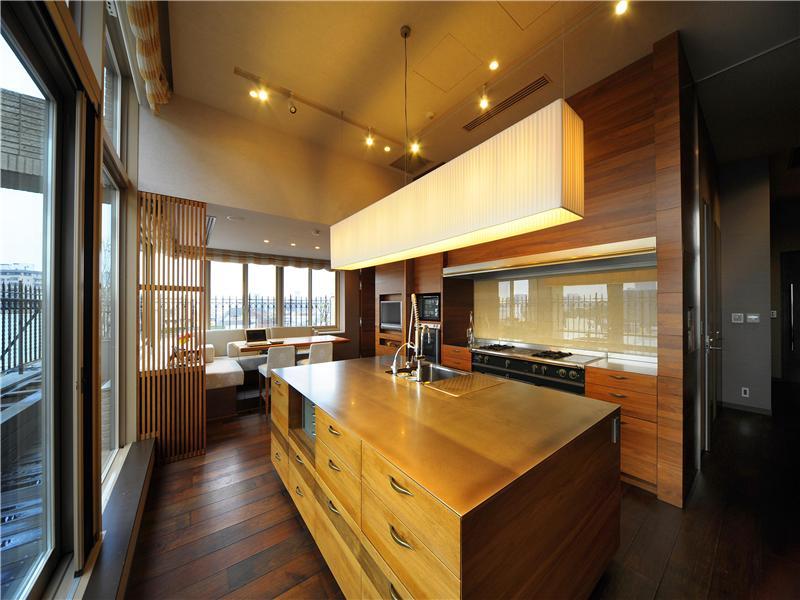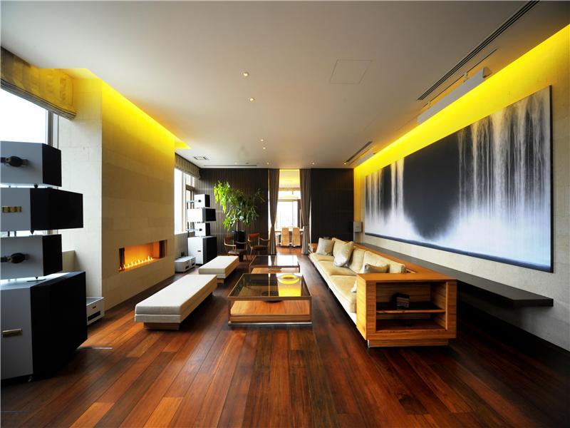 所有家具都是由Cecotti Collezioni定制的,大多数墙壁,门和地板由意大利进口的石头和木材制成。餐厅是日本风格的“Ryotei”,允许厨师直接从美食厨房服务。下一站式是露台,巴黎风格,允许阿里斯加瓦公园的视野。日本艺术家Hiroshi Senju的原位绘画在家中举行。配有一个庭院花园,没有皇家花园。它有一个完整的浴室,而两个浴室是部分的。所有厨房用具都是由Cornue提供的。