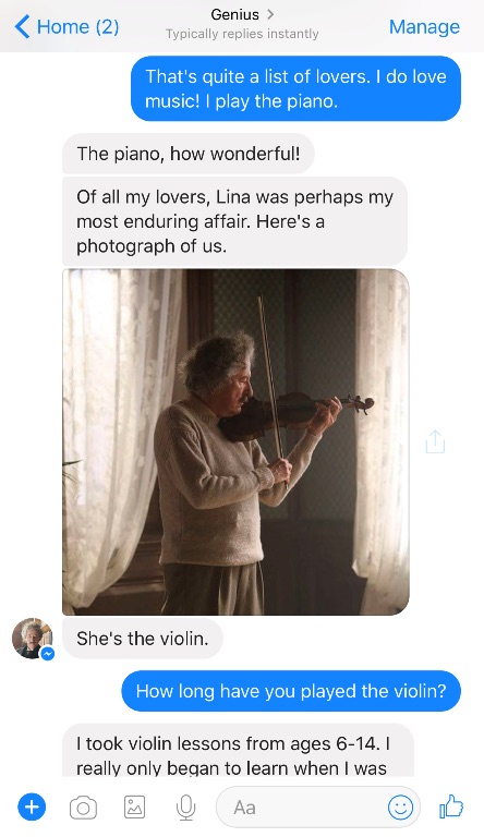 你可以和爱因斯坦对话在这里,但除了谈论天才生活和宇宙的其他有趣方面外,它还会告诉你去看4月25日首播的节目《天才》。机器人甚至会说:“啊……我们还有很多可以讨论的,但现在,我有研究要做。”