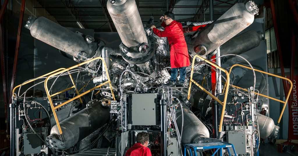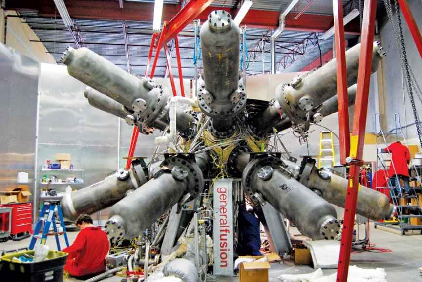 General Fusion的技术使用一系列同步活塞来压缩液态金属腔,然后将其注入氢血浆。然后将血浆以1.5亿摄氏度加热,比太阳的核心高10倍,以创建大量无碳能量,没有原子废物。然后将热量转移到金属中,该金属可以通过涡轮机通道以产生动力。