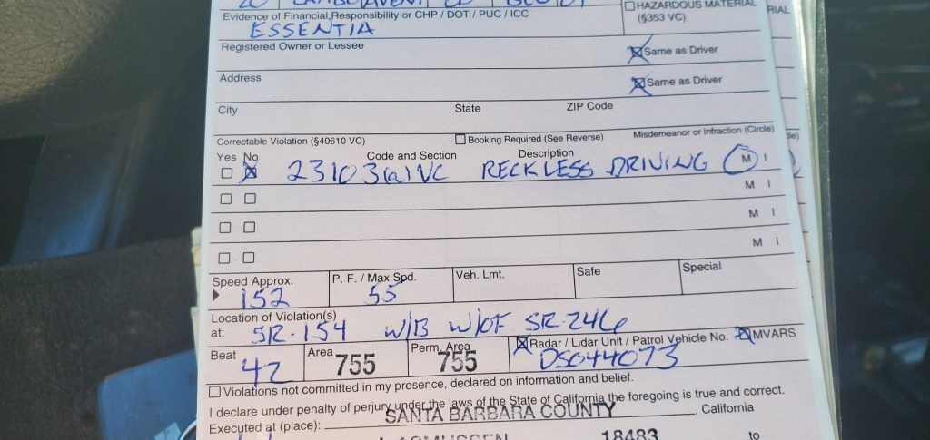 照片由CHP Buellton共享显示了路边的一辆黑色兰博基尼和部分书面罚单,显示司机的时速为152英里每小时。154号高速公路的限速是每小时55英里。