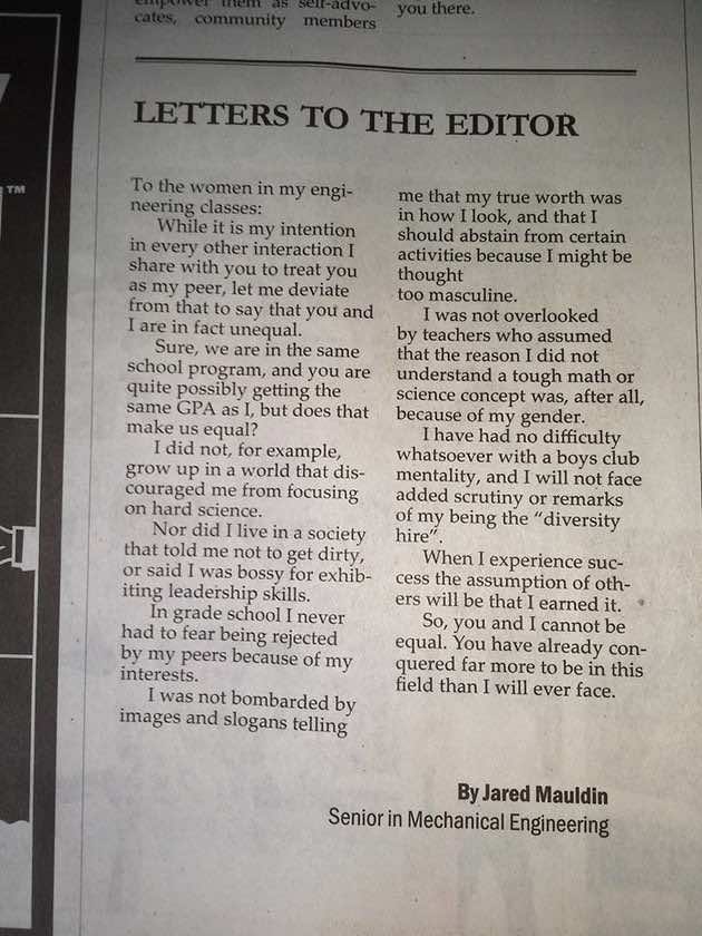 最近,东华盛顿大学机械工程专业的一名大四学生就他在STEM领域看到的性别偏见写了一封全面的公开信,并将其寄给了校报的编辑的东方人.他向校园里的所有女性发表讲话,告诉她们在不同的层面上是如何受到偏见的对待,因此她们根本不平等。虽然这看起来像是女性主义,但问题的根源远远隐藏在我们通常看到的东西之下。以下是完整的信: