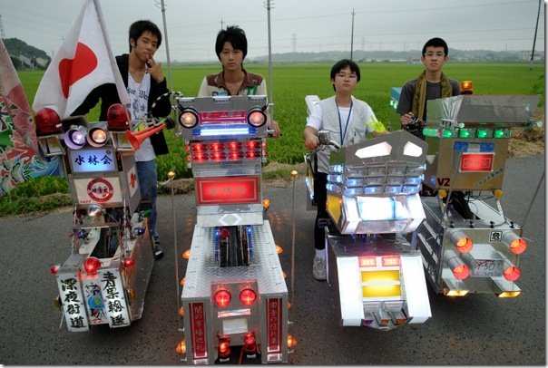 日本有一些Dekochari自行车帮派,其中包括所有日本Hishyomaru舰队,全日本DC俱乐部Ryumaki和All Japan Kyokugenmaru Gang。这些自行车帮派对社会没有任何威胁,而是利用他们的创造力来装饰自行车并在特殊活动中展示他们的技能。由于精美的灯光显示器和高保真声音系统是Dekochari自行车必须的,因此大多数车辆都采用闪亮装饰下方的汽车电池以操作该系统。