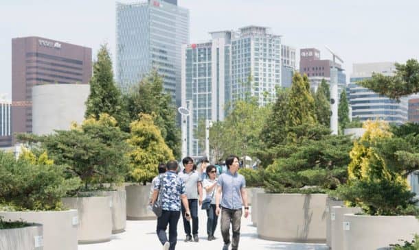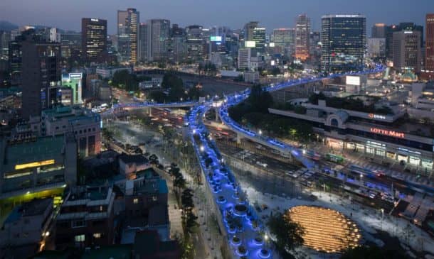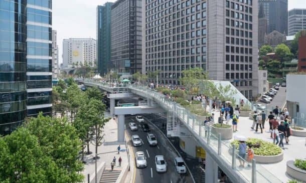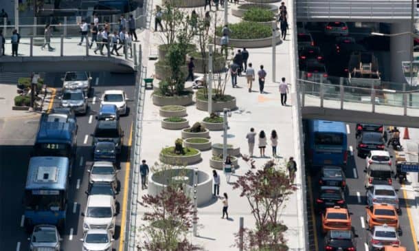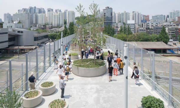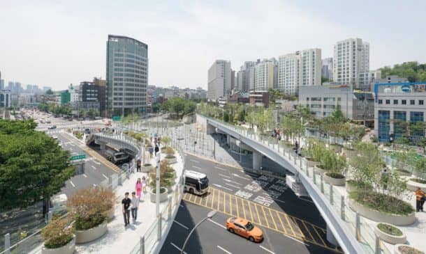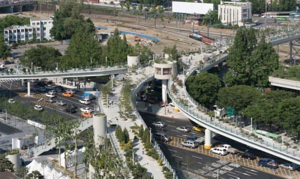 MVRDV设计已任命Seoullo 7017年韩国,意味着“首尔街”,并修改了1970年代的高速公路变成绿色空间为人民,为行人提供了一座桥梁。名称中的“7017”结合了1970年和2017年,多年来高速公路建成,现在它是翻新。
