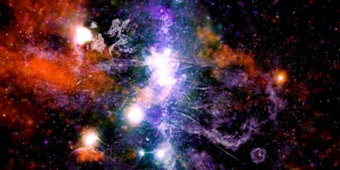 “银河中心的新全景是基于钱德拉和其他望远镜的先前调查。该最新版本将钱德拉(Chandra)的高能量视图扩展到了银河系飞机上方和下方(即大多数银河恒星居住的磁盘),而不是以前的成像努力。在我们主要图形中的图像中,钱德拉的X射线是橙色,绿色,蓝色和紫色,显示了不同的X射线能量,Meerkat的无线电数据显示在丁香和灰色中。图像中的主要功能以标记版本显示。” NASA在包含令人敬畏的图像的帖子中写道。
