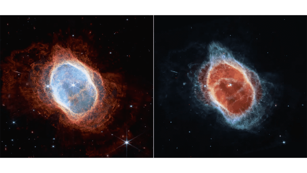 左边是韦伯近红外相机(NIRCam),右边是中红外仪器(MIRI),这两幅图像突出了船帆座中发现的南环星云,距离地球约2000光年。
