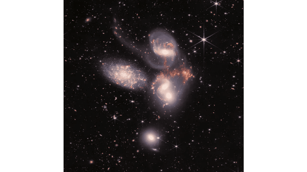 另一个宇宙进化线索是斯蒂芬五重奏,它是飞马座中由5个星系组成的星团,距离我们4000万光年到2.9亿光年之间。斯蒂芬五重奏的独特之处在于,它与宇宙早期的许多星系团相似,它们之间复杂的相互作用可以极大地揭示星系的演化过程。