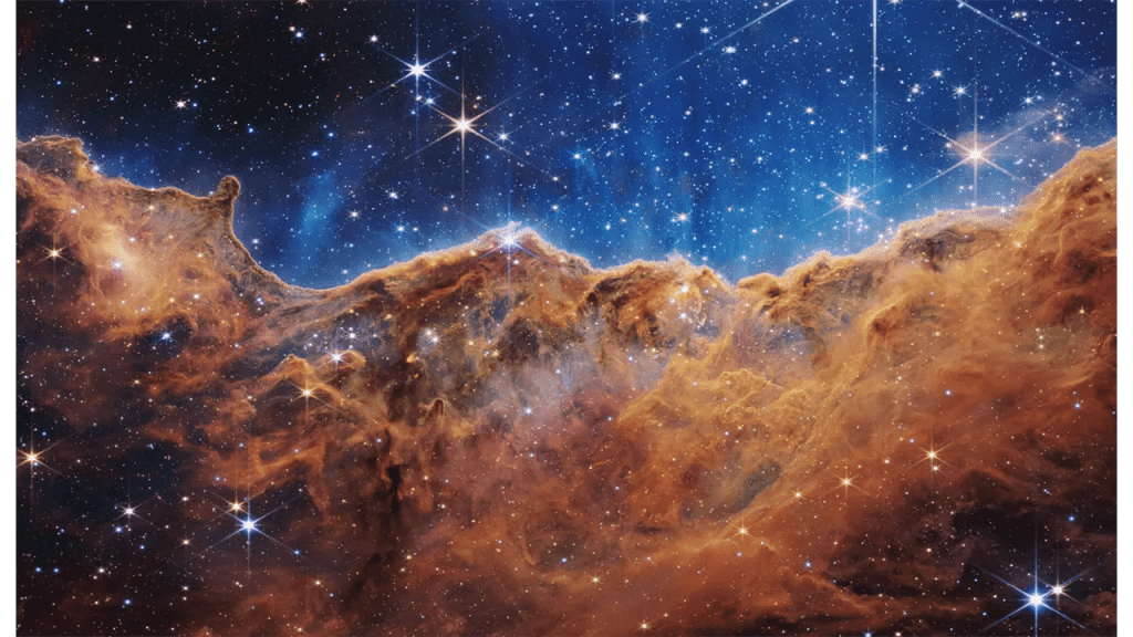 最后,船底座星云中的“宇宙悬崖”的图像。它位于船底座星座,距离地球8500光年,与它壮观的外观相匹配的是,詹姆斯·韦伯望远镜能够穿透尘埃,发现类似的物体,这些物体曾经被隐藏在人们的视野中。