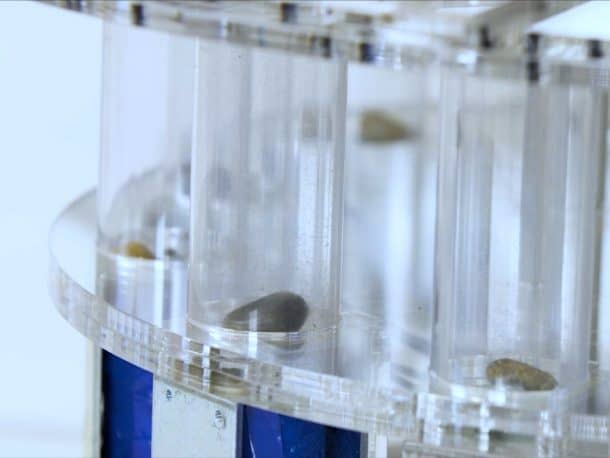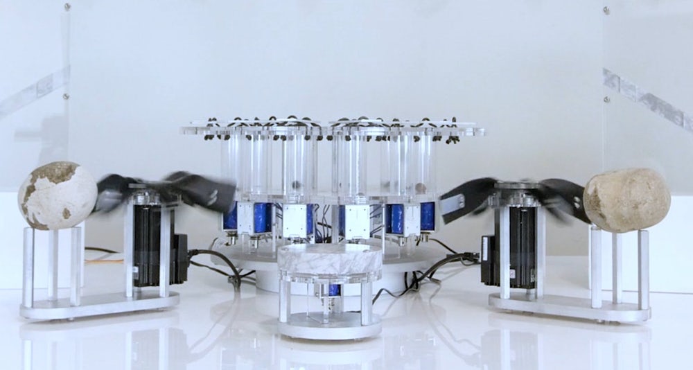 “当收到一张纸条,岩石的轴旋转,另一个是引导远离磁铁,推出了在空中。它落在一块大理石,削减规模以适应机器。”