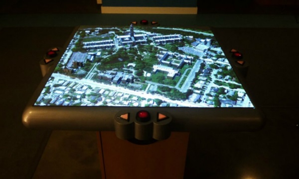 当你与电脑互动时,电脑会宣布建筑物的名称,并提供方向,当你把手指放在适当的位置时,会添加更多信息。对于那些视觉感觉完好的人来说,建筑物的名字和头顶上投影仪的聚光灯照亮了它。这款投影仪可以配置为投影匹配的卫星图像,视觉效果和自定义图像。