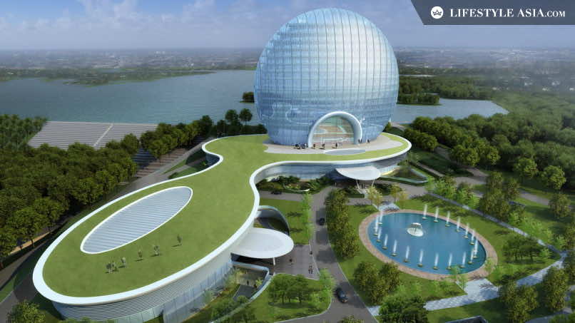 酒店从正面看,像一个97米(21层楼)高的圆形,但如果你看整体设计,它就像一个部分埋在地下的圆盘。