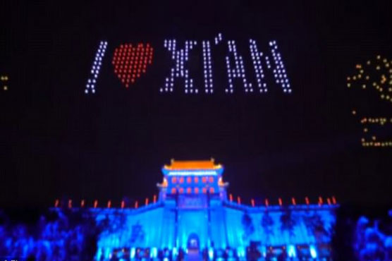 无人机形成了16个不同的3D图像。无人机的数量保持在1374架,是为了纪念无人机从13.74公里长的西安城墙起飞。一些无人机在表演接近尾声时编队破裂,掉落在地上。