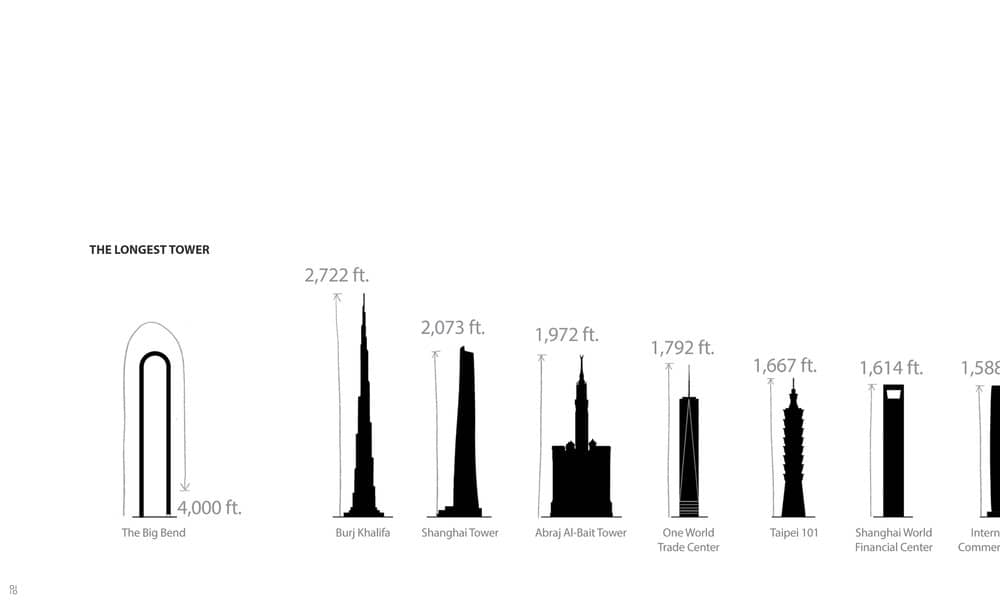 Burj Khalifa是世界上最高的建筑,只有2,722英尺。大弯计划的长度为4,000英尺,这是长度,而不是高度。摩天大楼弯曲成U,将该长度折叠成一半。