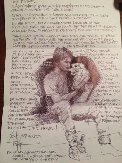 The shoes were delivered to Michael J. Fox along with a handwritten note from Nike shoe designer Tinker Hatfield that said, ‘as the first, most celebrated wearer of the Nike Air Mag we wanted you to be the first to receive a living pair.’ Here’s to hoping that we get to wear these shoes in 2016!
