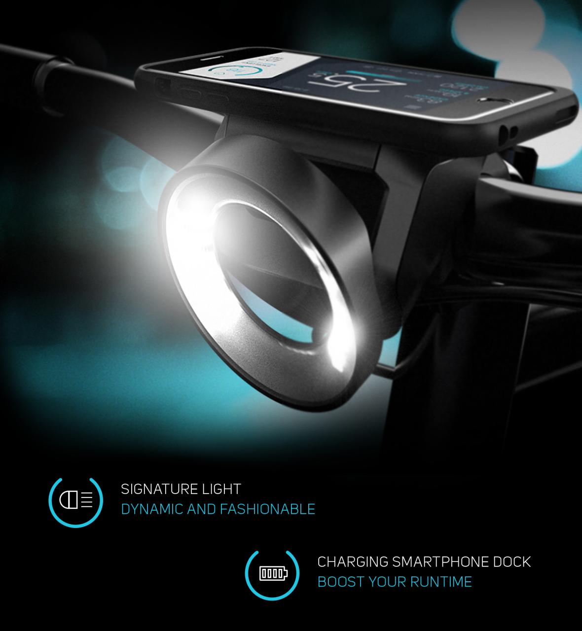 一家名为Icradle的德国初创公司创建了Cobi System,这是将传统自行车转变为智能自行车的创新方式。该系统利用用户的智能手机在将手机放入轮毂中时运行Companion应用程序 - 在车把上固定的IPX6防水码头。该轮毂还设有LED大灯(最大输出25 lux在33英尺处),加速度计,高度计,气压计,环境光传感器和电喇叭。