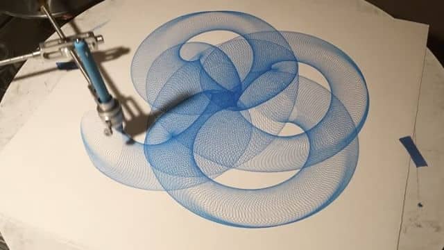 甘迪(Gandy)在他的Instagram帐户上展示了他的一些机器人涂鸦,即使没有任何光学幻觉,也可以在行动中看到它也非常有趣且催眠。他结合了滑轮,齿轮和电动机。他的机器产生的数学完美模式非常令人满意。
