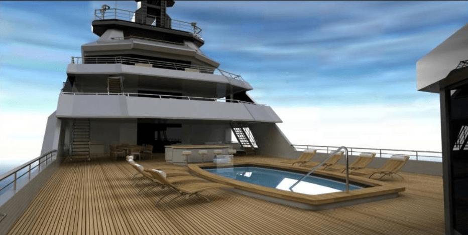 游艇还设有一个游泳池,带有瀑布的特征,甚至可以进入船舶的直升机。店主的豪华房间可以在游艇的上层建筑上高处欣赏全景,还有一个私人浴室,可欣赏海景。游艇有一个主要的休息室,可容纳客房的大钢琴。