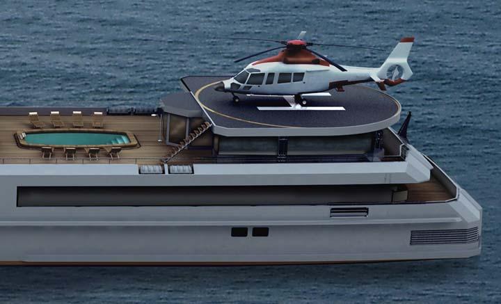 游艇将归功于4个劳斯莱斯海洋卑尔根柴油发电机,最高速度为16.5节。内部和外部设计是由屡获殊荣的设计公司Nuvolari Lenard进行的。游艇还设有Helipad,还可以配备能够缩回的平台;将直升机从船上的机库中降低并升级到机库中。