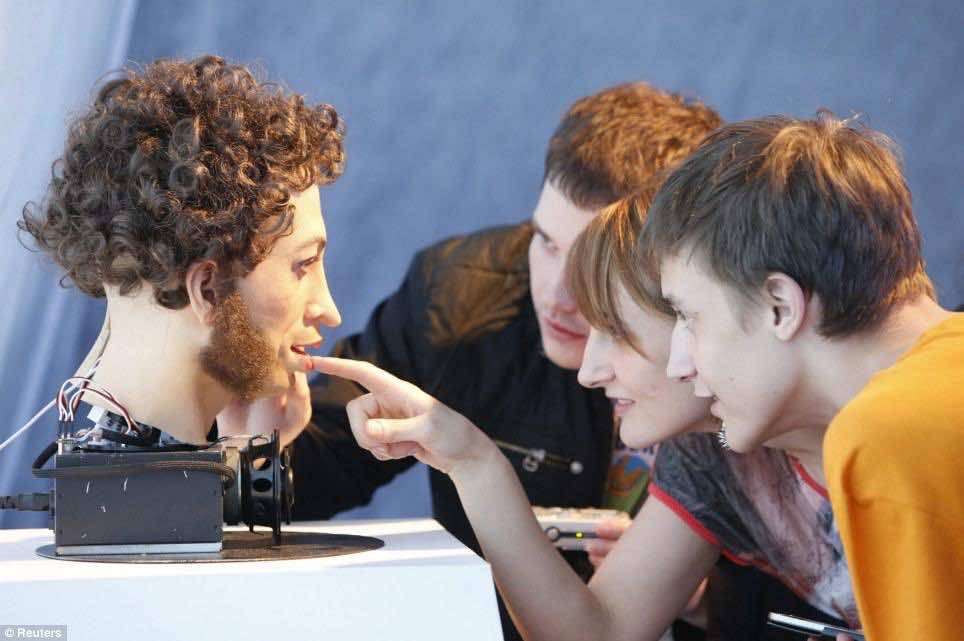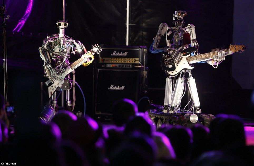 德国金属乐队由三个身高5英尺高的机器人,他们震撼和惊讶的人群在莫斯科展览中心ARTPLAY设计机器人球。