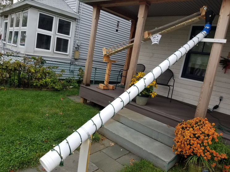 他的最新成就是建造了一条传送带,把零食送到溜槽里,然后把零食送到8英尺外路边的碗里。