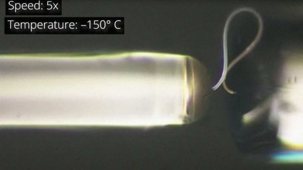 他们试图在不同的温度下冻结,并发现以-150摄氏度制成的超细纤维显示出弹性特性。他们可以弯曲至最大应变10.9%。普通冰的弹性应变为0.3%,因此您可以想象这一发现的确有多好。从理论上讲,他们可以将这个数字提高到15%,因此很高兴知道仍然有很多事情要发现。