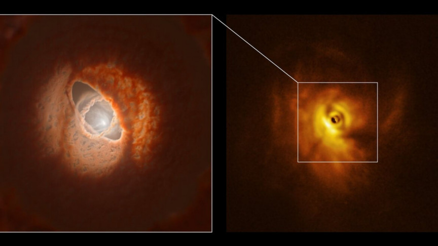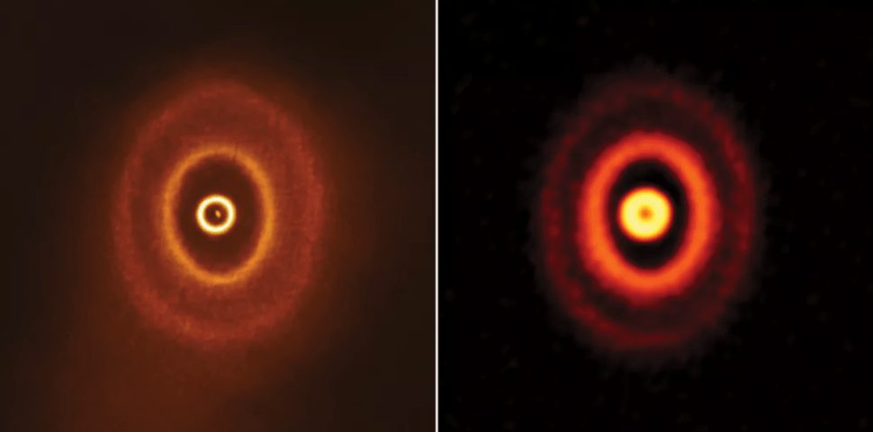 根据欧洲南方天文台(ESO)的说法,光盘中的差距可能是由于系统中一个或多个行星的出现而引起的,如果是这种情况,这将是第一个在旋转三颗星的行星同时。