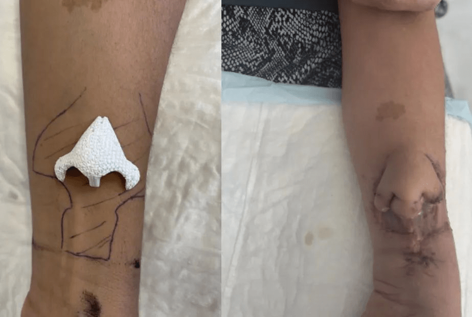 外科医生与比利时医疗设备制造商CERHUM的临床团队合作,开发了一种基于生物材料的鼻形结构。然后将其植入并培养在患者的手臂上,一旦准备就绪,就会通过“吻合”显微手术进行血管重建。