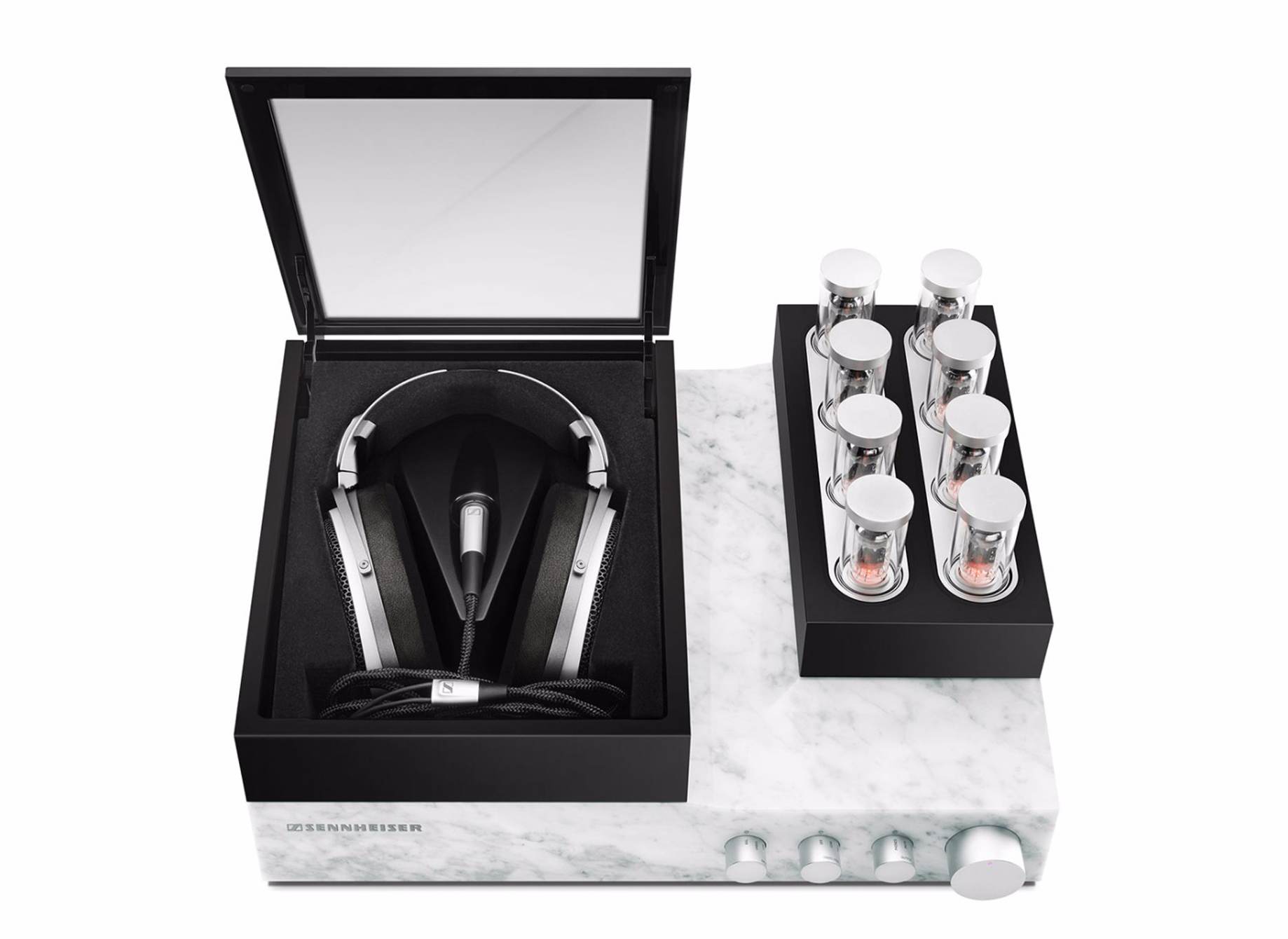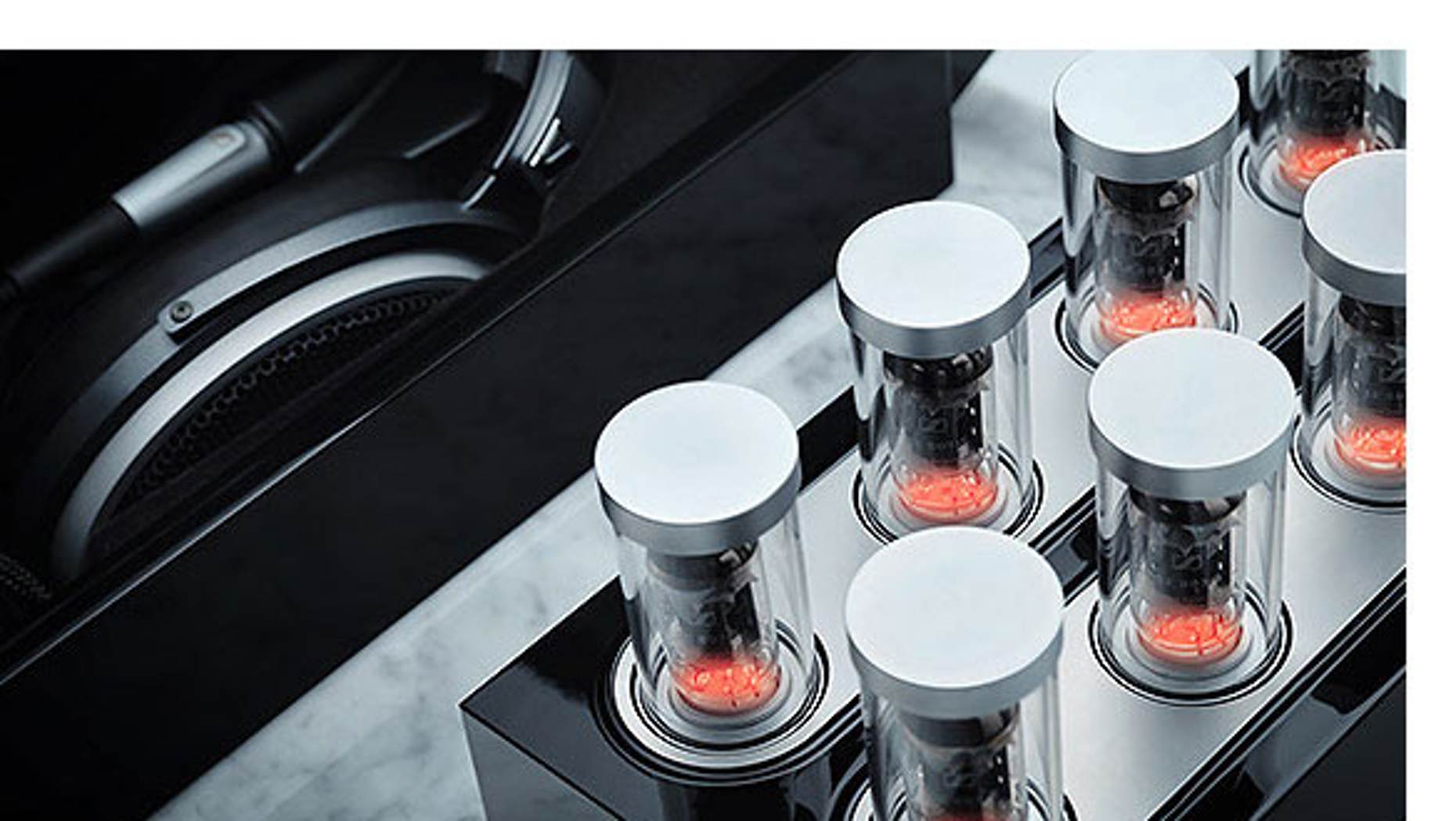 耳机的充电过程非常迷人,堪称艺术杰作。当系统不工作时,控制旋钮和内部放大器组件在玻璃和大理石外壳内缩回。然而,打开/关闭音量控制一个轻微的推动,使系统的生活;控制旋钮由一块镀铬黄铜制作而成,从大理石外壳延伸出石英玻璃真空管,从底座上升起。凸起的玻璃罩可以让你摘下耳机。耳机的耳罩由精密加工的固体铝制成,覆盖着皮革和无过敏的丝绒超细纤维。