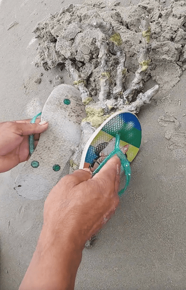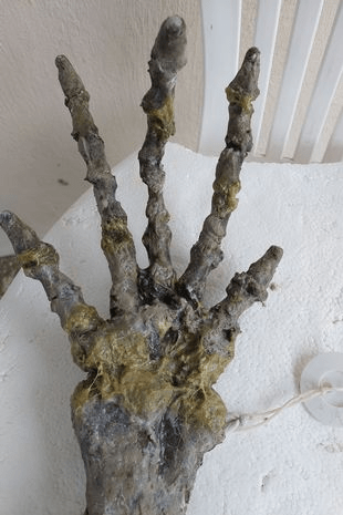 这对夫妇拍摄手长瘦骨嶙峋的手指旁边Leticia的触发器在发现它在巴西的海滩上凸显了巨大的骷髅手。
