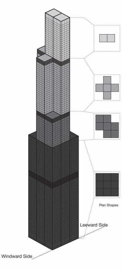 SOM提出了一个由9个高度不同的互锁管组成的上层建筑,划分为75 ' x 75 '的正方形,这些独立的建筑连接在一起成为一个整体。不同的高度允许建筑后退,符合后退规则,并创造了标志性的摇摇晃晃的效果,该建筑以其闻名。“束管”结构由SOM的工程师Fazlur R. Khan创新,这9根管构成了摩天大楼的基本结构。这一创新使Fazlur Khan成为20位最具影响力的结构工程师之一th一个世纪,一直持续到今天。这种系统允许较低的楼层(西尔斯的办公室将设在那里)有较大的开放办公空间和较小的楼层,因为大楼的高度不断上升,可以一览城市的全景。