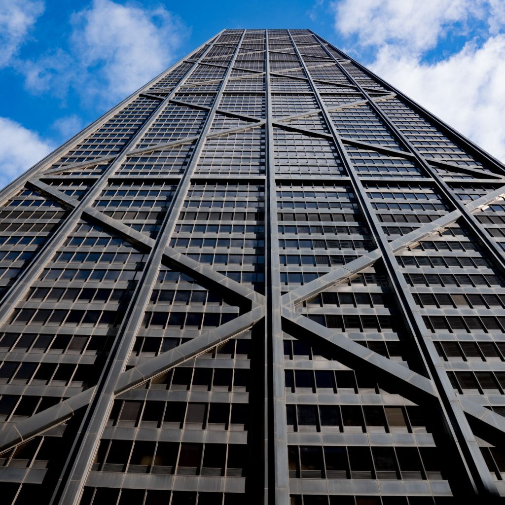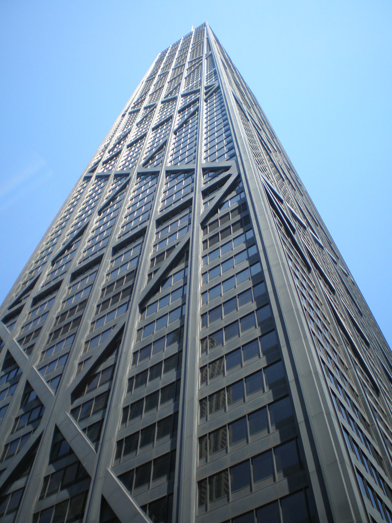 这位100层的摩天大楼是由建筑师Bruce Graham和Skidmore,Owings和Merrill的结构工程师Fazlur Khan设计的。这是世界上第一个混合用途的高层建筑,其中包含办事处,餐馆和世界第三高的住所,约有700个公寓。摩天大楼独特的X支撑外观是结构表现主义风格的最著名建筑之一,表明该结构的皮肤是其“管状系统”的一部分。这是设计师用来实现创纪录高度的工程技术之一。管状系统是在风和地震载荷期间保持建筑物直立的结构。由于芝加哥的大风,必须考虑到的主要因素之一是为建筑物使用安全结构,该建筑物可以最大程度地减少大风日的运动。这种X支撑既可以使高层结构的性能更高,也可以打开内部平面图。尽管X支撑是巨大的,并且从内部略微遮挡了视图,但它是汉考克建筑物的标志性外部特征,在结构上是合理的。