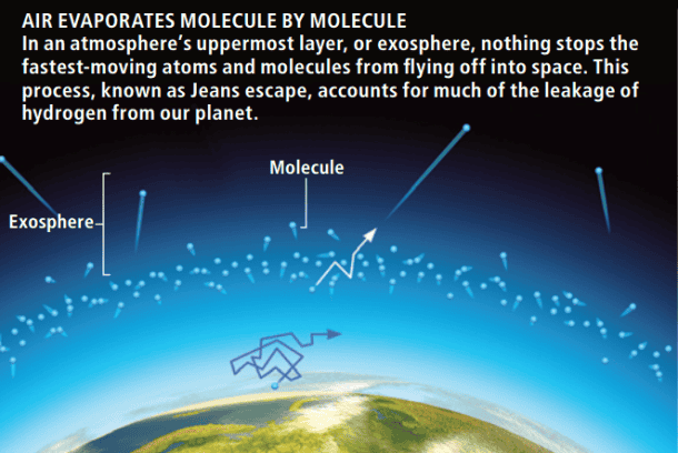 大气允许气压在其各层之间变化。下部气压高,反之亦然。泄漏到大气中的空气量非常低,这是由于上层的空气压力较小。从大气中逸出的较轻的元素遵循其分子动能的麦克斯韦分布。这种情况一直持续到高端分子达到逃逸速度,从而成功地将自己发射到太空中。这就是为什么氦和氢是较轻的气体,与二氧化碳相比更容易逸出的原因。