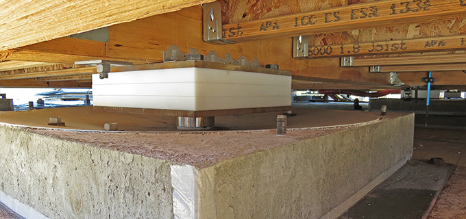 但是,最重要的变化是,这所房屋不是在传统基础上,而是置于“地震隔离器”上。这些隔离器包括12个由塑料和钢制成的滑块,它们的直径为4.5英寸,盘子和碗形盘子由放置在下面的镀锌钢制成。