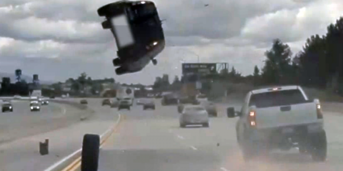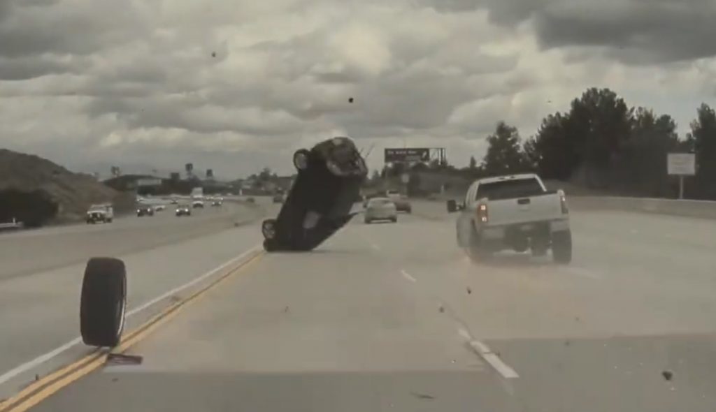 当起亚之魂停在西尔维拉多旁边时,一切似乎都很正常,直到卡车司机侧的前轮突然旋转起来,滚到了起亚的前面。起亚汽车以高速公路的速度碾过了直立的车轮,导致车轮滚到轮胎上,飞向空中。这辆车的高度几乎是西尔维拉多的两倍,然后撞回车顶。雪上加霜的是,同样被丢弃的车轮滚回了上下颠倒的起亚。