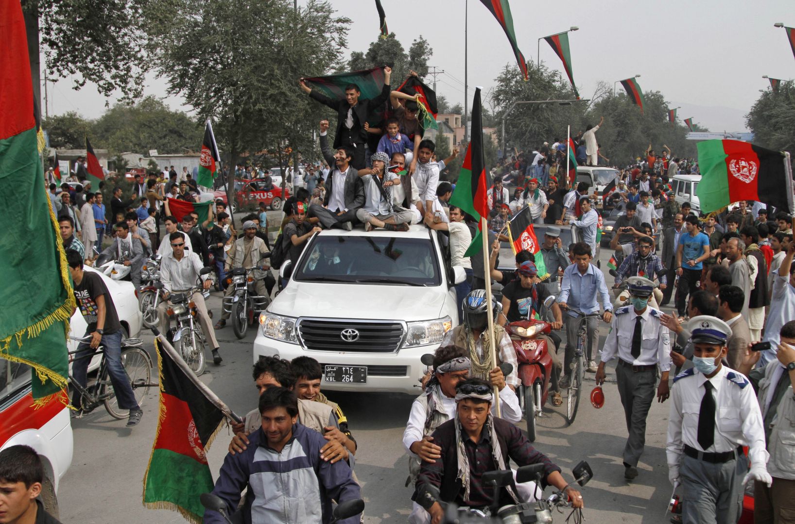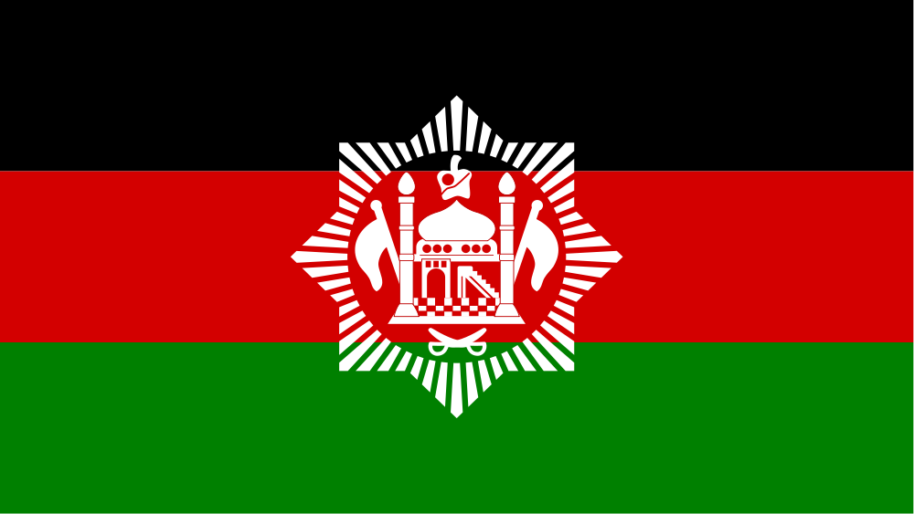 阿富汗伊斯兰共和国于2004年使用了现有的国旗。这面国旗就像1930年到1973年的阿富汗君主制时期飘扬的国旗一样。区别在于在中间的手盖顶部(黄色部分)包含了沙哈大。这面旗帜包括黑、红、绿三道阴影线。在过去的几十年里,这一直存在于阿富汗的大多数国旗上。中间的符号是阿富汗的传统符号,有一座清真寺,它的Mihrab显示Makah。