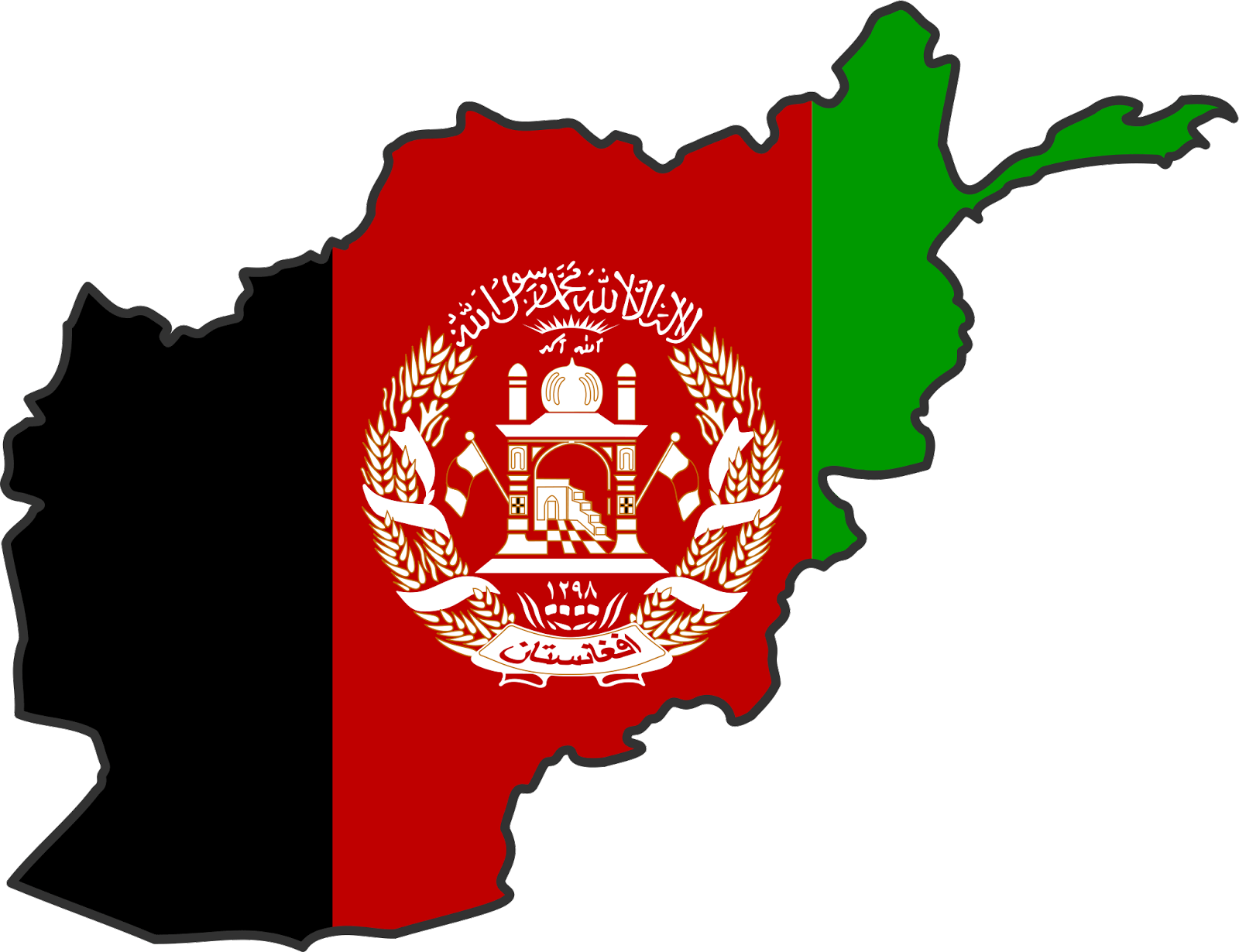阿富汗国旗由三种相同的红色条纹组成,红色条纹的中心有一个白色阴影的图标(mehrab)。在(Mehrab)的每一部分上有两个大米区,在大米区顶部,宣布了Shahdah,这表明没有上帝,只有安拉和穆罕默德是他的先知。