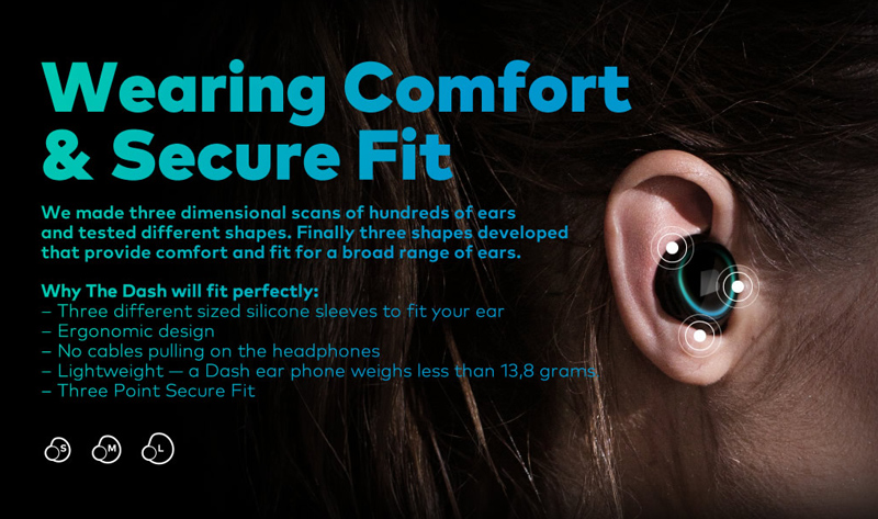 Dash可以被称为可穿戴的双微型计算机,配有生物传感器、麦克风、活动实时反馈教练、健身追踪器和Dash媒体播放器。Dash耳机通过蓝牙连接在一起,机箱中填充了硅胶,从而提供防水保护。用户只需轻按控制耳机,就可以通过蓝牙连接播放音乐或使用内置MP3播放器(4GB存储/ 1000首歌)。该公司称Dash耳机是“世界上第一个完全无线的智能耳机系统,提供自由的移动,最大程度的舒适和令人惊叹的声音,同时可以通过声音指导,跟踪移动和捕获关键的生物特征数据。”