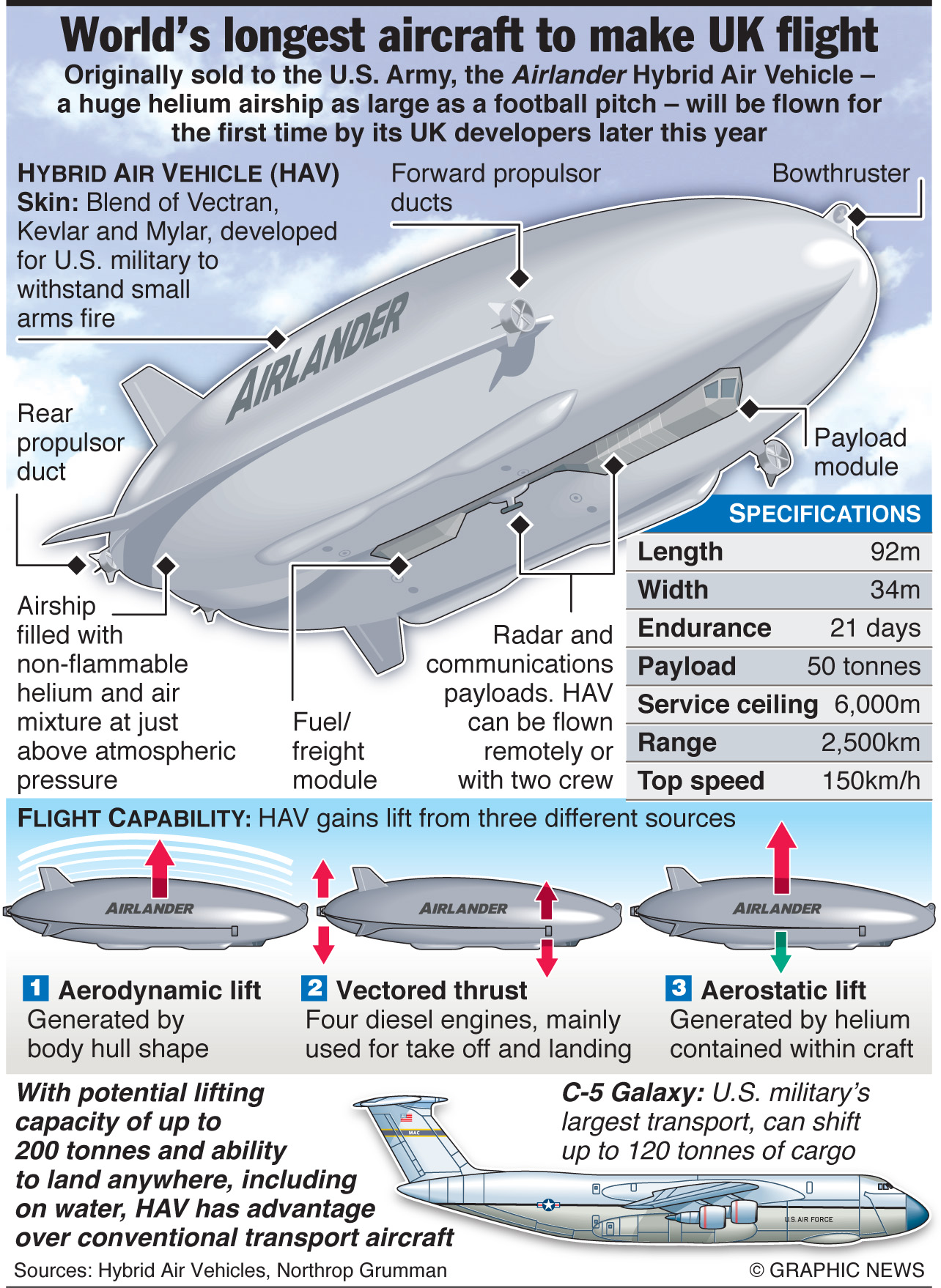 92米长的Airlander 10最初是为美国陆军设计的侦察机,但这个想法没有实现。研发这架飞机的混合动力航空公司已经从英国政府获得了340万英镑的拨款,用于将这架飞艇从地面起飞。这架飞机结合了一个巨大的氦气填充气动飞艇和一个货运和客运单元,一次可以飞行五天,可以在包括水面在内的一系列表面起降。这架飞机已经进入了下一个研发阶段,可以开始测试四台柴油发动机。混合动力航空车辆公司的汤姆·格伦迪说:“Airlander是一种可以携带大量货物长途飞行的飞机,一次可以在空中飞行数周。”