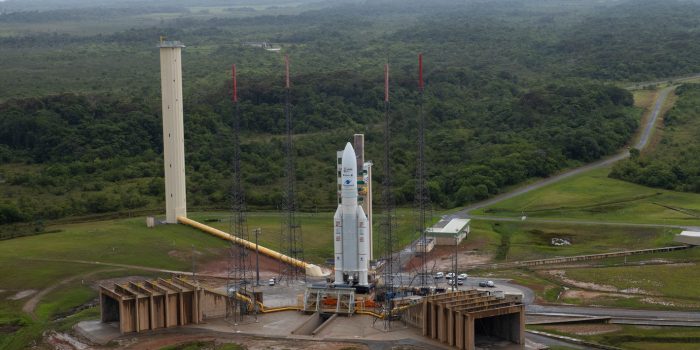 Ariane 5火箭在发射台上高高地位,JWST藏在Nosecone中。天空是有雾的,但以前被认为是发射延迟的原因的天气似乎现在还不错。