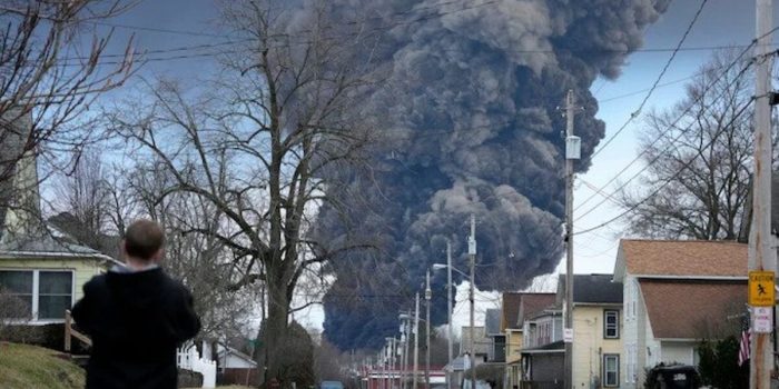 官员们试图避免一场失控的爆炸,故意从五节车厢释放并燃烧有毒的氯乙烯,将火焰和黑烟喷向天空。
