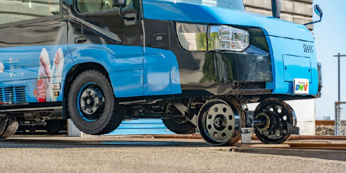 日本西部的一家铁路公司已开始进行双模式车辆(DMV)的商业运营,可以在轨道和道路上进行。